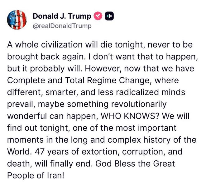 In Trump’s address to the nation last week, he threatened to “bring them back to the Stone Ages, where they belong”. Today, he threatened to destroy an entire civilization.
